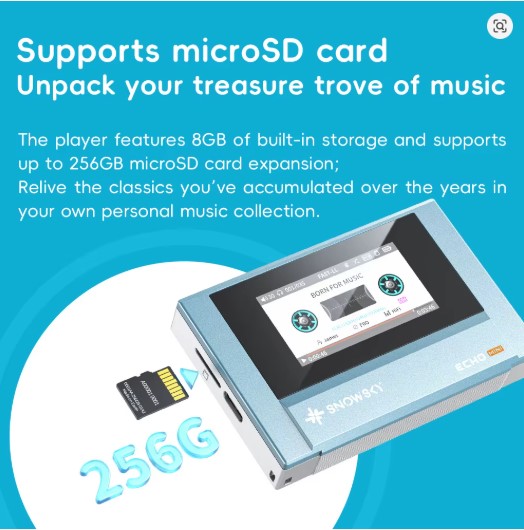📦 Contenido del Paquete: Reproductor SnowSky FiiO Echo Mini, cable de carga USB-C y manual de usuario.